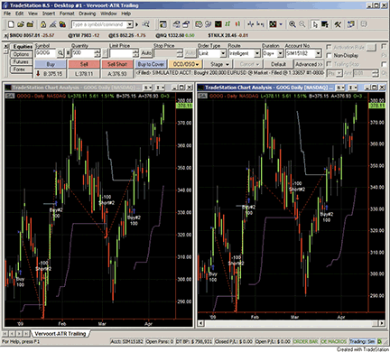 Figure 1: TRADESTATION, ATR trailing stop strategy. Here is an example of the Vervoort ATR_Trail strategy on a chart of Google, Inc. (GOOG). The levels at which the strategy enters new long positions are displayed by the cyan lines. The short entry levels are displayed by the magenta lines. The chart on the left displays the levels based on the original ATR trail calculation. In the chart at right, the modified calculations are used.