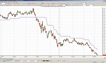 To attach the indicator to a chart (Figure 15), click the right mouse button within the chart window and then select “Add Indicator” -> “TASC - 06/2009 - Trailing Stoploss Reversal Level (Atr)” from the indicator list.