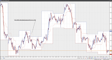 Figure 15: VT TRADER, ATR TRAILING STOP. Here is an example of the ATR trailing stop reversal-level indicator on a 30-minute candlestick chart of EUR/USD.