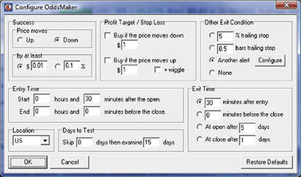 That’s the strategy, but what about the trading rules? How should the opportunities that the strategy finds be traded? For the stop-loss, we used one of the more advanced options available in the OddsMaker. Instead of using a traditional stop-loss, we selected “Another alert” as the exit condition called “Trailing stop, volatility down.” This alert is triggered when a stock moves down an amount equal to the average 15-minute volatility multiplied by the number of 15-minute bars we decide on — in this case, 2. For example, if the average 15-minute volatility is 10 cents, this alert would not trigger until a stock moves down at least 20 cents.
