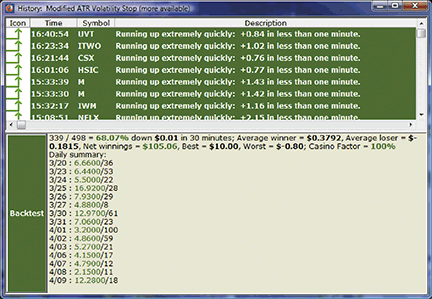 In “Average True Range Trailing Stops” in this issue, Sylvain Vervoort creates a trailing stop based on the average true range value on a portfolio of 25 stocks and pursues the question of whether it’s a better stop than the fixed-percentage trailing stop method demonstrated in his May 2009 article. Subscribers to Trade-Ideas Pro who use our event-based backtesting tool, The OddsMaker, already understand the different premise these tools use to find high-probability winning trades. To recap briefly, The OddsMaker doesn’t just look at 25 stocks, à priori, to generate backtest results, it considers any stock that matched a desired pattern in the market, finds that stock, and applies the backtest’s rule set before summing up the results into a detailed set of totals: win rate, average winner, average loser, net winnings, and confidence factor. (See Figure 18.) As such, we provide an alternative stop method and another strategy for your consideration.