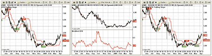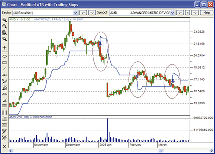 Figure 2: eSIGNAL, AVERAGE TRUE RANGE TRAILING STOP. Here is a demonstration of the ATR trailing stop, the modified ATR, and the modified ATR trailing stop.