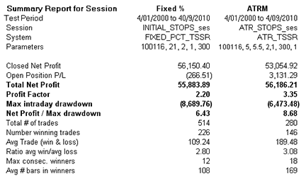 Figure 18: TRADE-IDEAS, RESULTS. Here are sample results from The Oddsmaker for the modified ATR volatility stop strategy.