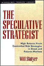 The Speculative Strategist: High Returns From Controlled Risk Strategies in Stock and Futures Markets by Will Slatyer is from the McGraw-Hill Traders' Library (1996, 173 pages, $34.95 hardcover, ISBN 0-07-058143-6). The book uses pirate analogies to colorfully illuminate key aspects of trading strategies. The book's goal is to show the reader how to develop a consistent policy of controlled risk in speculation. It guides the reader on formulating an investing strategy that reflects the speculator's goals, capital, temperament, risk exposure and comfort level. It also describes modern computer-assisted methods for those with limited time.The book examines a range of key aspects of speculative trading, including strategy, tactical entry and exit points, charting the market with indicators, the Woodes Rogers model for speculation and intraday trading.