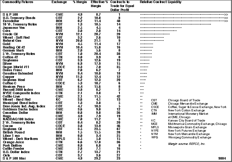 All futures listed are weighted equally under "contracts to trade for equal dollar profit." This is done by multiplying contract value times the maximum possible change in price observed in the last three-year period. Thus, all numbers in this column have an equal dollar value.