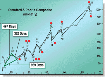 Three important turning points between 1974 and 1978 have influenced the growth pattern of many subsequent major and minor market moves, up to and including the July 20, 1998, peak and the September and October 1998 lows for the Dow Jones Industrial Average (DJIA) and the Standard & Poor's 500, respectively. Here's how the triangle in Figure 1, which connects the 1974 low for the S&P 500 index with the 1976 peak and 1978 low, have influenced these subsequent market moves. The triangle seen here connects points 1, 2, and 3 from Figure 2. The points in Figure 1 and 2 are those moves analyzed in this article.