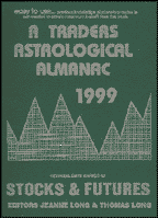 A Traders Astrological Almanac 1999 (129 pages, $95 paper, 1999), edited by Jeanie Long & Thomas Long, published by Professional Astrology Service. This book is written for traders; no previous knowledge of planetary cycles is needed to benefit from reading it. Planetary reversal dates (which translates into market reversal dates) are marked in calendar format in this easy-to-read book. Filled with technical articles from financial analysts and researchers who use planetary cycles, this book illustrates astrotrading tools to give you an edge in trading and investing.