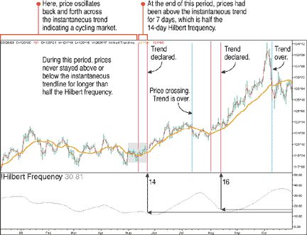 Traditionally, moving averages have been used to study trend mode because the moving average forms a visual trend of the data. By using a technical market model of a trend plus a dominant cycle, I created something I call an instantaneous trendline by removing the dominant cycle from the price information. I can do this because I measured the period of the dominant cycle using the technique I described in the March 2000 issue (see sidebar, "Using the Hilbert transform").