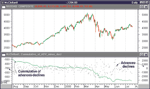 FIGURE 1: NASDAQ CUMULATIVE A-D LINE. The cumulative A-D line is the cumulative sum of daily advances minus declines. Nasdaq breadth narrows in 2000 and shows some flattening in the trend. The trend of the cumulative is the significant feature.