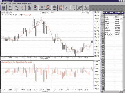 FIGURE 3: SMARTRADER, DETRENDED PRICE CHART. To generate the detrended price chart, simply define a simple moving average -- five bars, in the case of this intraday chart -- then select the Detrend plot. Detrend defaults to the first moving average found in the price chart to create the Detrend plot. If there are multiple moving averages, the preferred moving average can be selected.