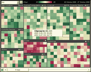 The top of the carpet screen shows the extremes in indicator value (Figure 1: colored bar going from +25 to -25 at the top of the chart for relative strength index, or RSI). I can look at indicator changes (Figure 1: small triangle in upper left), as opposed to absolute values of the indicator. For indicator parameter changes, I control the number of days by clicking and dragging either the left- or right-hand edges of a slider (Figure 1: rectangle at bottom with "6" in it) and the starting date by moving the slider along the line at the bottom of the chart. Clicking on a square shows the company and the indicator values.
