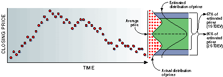FIGURE 1: STANDARD DEVIATION. The STDEV is a statistical measure that identifies volatility in a price series. The mathematics behind STDEV estimates that two standard deviations plus or minus from the base series should contain 95% of the observed data.The STDEV is a statistical measure that identifies volatility in a price series. The mathematics behind STDEV estimates that two standard deviations plus or minus from the base series should contain 95% of the observed data. (See Figure 1.)