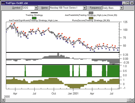 Users of NeuroShell Trader can go to the Stocks & Commodities section of the Ward Systems Group free technical support website to download an average trade P/L chart (Figure 1), which also contains the AveTrade, TstatSignificant, NumWins, NumRuns, and RunsZscore indicators saved as custom indicators in the Traders' Tips custom indicator category.
