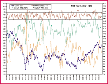 Figure 1: Four-day sum of intraday highs and lows. Here you see areas where there is a low degree of correlation. To accommodate, the three-, four-, and five-day series were combined into one value plotted at the top of the chart as the tick oscillator.