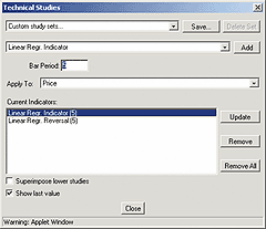 Linear Regression Indicator--This behaves like a moving average, but with reduced lag time; as the article states, this "hugs" the prices and is based on the least- squares fit method of statistics Linear Regression Reversal--A binary indicator, this displays +1 when the price direction is up and -1 when the price direction is down. Moving from -1 to +1 (or from +1 to -1) is indicative of a price reversal. You can choose any or all of these indicators within the Technical Studies dialog box (Figure 16), and you can set the bar period for either of them; the figure you entered will be shown parenthetically with the indicator itself.
