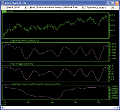 Figure 10: NeoTicker, momentum indicators. Here's a daily Dow Jones chart with the three indicators momentum fractional indicator, the momentum percentage I(n) indicator, and the momentum percentage J(n) indicator.
