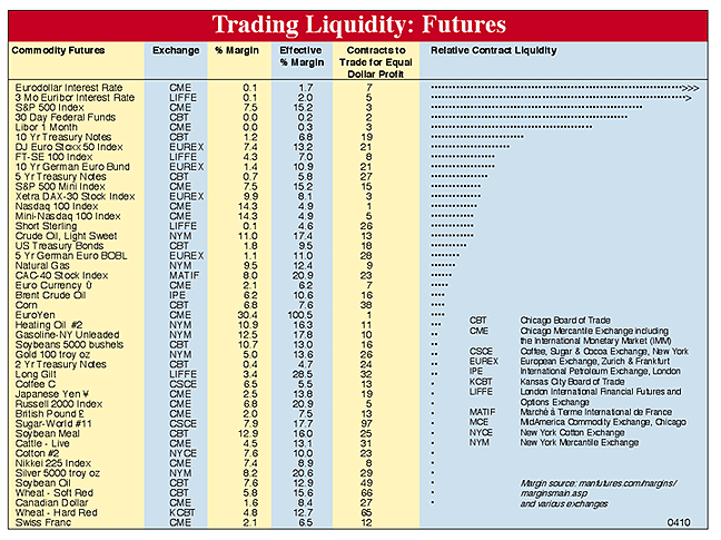 Trading Liquidity: Futures is a reference chart for speculators. It compares markets according to their per-contract potential for profit and how easily contracts can be bought or sold (i.e., trading liquidity). Each is a proportional measure and is meaningful only when compared to others in the same column. The number in the "Contracts to Trade for Equal Dollar Profit" column shows how many contracts of one commodity must be traded to obtain the same potential return as another commodity. Contracts to Trade = (Tick $ value) x (3-year Maximum Price Excursion). "Relative Contract Liquidity" places commodities in descending order according to how easily all of their contracts can be traded. Commodities at the top of the list are easiest to buy and sell; commodities at the bottom of the list are the most difficult. "Relative Contract Liquidity" is the number of contracts to trade times total open interest times a volume factor, which is the greater of: 1 or exp (1n (volume) / 1n (5000)) - 2.