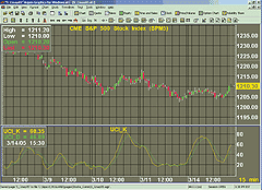 Apply both of these studies in the same split window on a chart to give you the smoothing on both the %K and the %D lines.These stochastic oscillators use a six-period simple moving average applied to a 12-period fast stochastic to achieve a normalized and scalable indicator. We have included a period parameter and a smoothing parameter that can be manually modified after the study has been applied to the chart. A sample chart is shown in Figure 10.