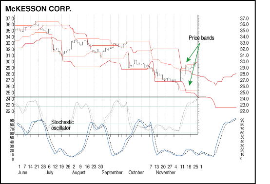 Figure 1 shows the price action of McKesson Corp. (MCK) in the autumn of 2004. The upper window shows the price bars along with 14-day price bands of the highest high and lowest low. The chart shows a series of downward price breakouts, most notably on July 1 and September 8. The lower window shows a 14-bar stochastic.
