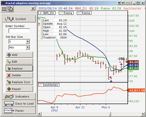 FIGURE 8: NEOTICKER, FRACTAL ADAPTIVE MOVING AVERAGE. Here's a sample NeoTicker chart showing a crossover system constructed using the FRAMA indicator.A downloadable version of this indicator and sample chart will be available at the NeoTicker Yahoo! User Group.