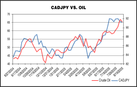FIGURE 1: CAD/JPY VS. CRUDE OIL. The correlation between the two is just remarkable. Who would have guessed?- Kathy Lien is the chief strategist of FXCM.Originally published in the November 2005 issue of Technical Analysis of STOCKS & COMMODITIES magazine. All rights reserved. © Copyright 2005, Technical Analysis, Inc.