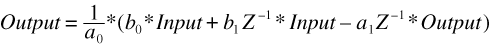 In this case, both the input and output involve only a constant term and a term having one unit of delay. By cross-multiplying and factoring, we can describe the output in terms of the input as: