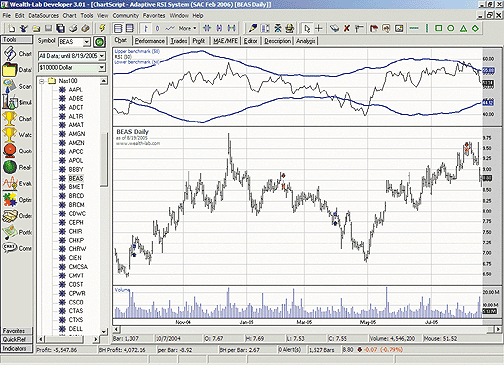 FIGURE 2: WEALTH-LAB, SELF-ADJUSTING RSI. The adaptive benchmarks used for entry/exit signals (shown as blue lines in the RSI pane) change according to the RSI volatility. The system performs well with Bea Systems (BEAS) during the test period shown.var bar, rsi1, upper, lower, rsipane: integer; const n = 50; //Period for RSI const c = 2; //Multiplier //Creating indicator rsi1 := RSISeries(#Close,n); //Creating upper/lower benchmarks upper := SMASeries(ABSSeries(SubtractSeries(RSISeries(#Close,n),SMASeries(RSISeries(#Close,n),n))),n); upper := MultiplyseriesValue(upper,c); lower := MultiplySeriesValue(upper,-1); upper := AddSeriesValue(upper,50); lower := AddSeriesValue(lower,50); // Charting rsipane := CreatePane(100, true, true); PlotSeriesLabel(upper, rsipane,#blue,#thick,'Upper benchmark ('+inttostr(n)+')'); PlotSeriesLabel(rsi1, rsipane,#black,#thin,'RSI ('+inttostr(n)+')'); PlotSeriesLabel(lower, rsipane,#blue,#thick,'Lower benchmark ('+inttostr(n)+')'); for Bar := n*3 to BarCount - 1 do //n*3 is needed to stabilize the RSI indicator begin if not LastPositionActive then begin if CrossOver(Bar, rsi1, lower) then BuyAtMarket(Bar+1, 'Long'); end else if CrossUnder(Bar, rsi1, upper) then SellAtMarket(Bar+1, LastPosition, 'Exit Long'); end;-- José Cruset