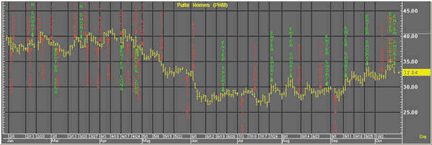 FIGURE 9: TRADECISION, STOCHASTICS WITH A LONG-TERM EMA FILTER. To reduce the time required for optimization, we can either reduce the number of optimization parameters or use genetic algorithms for the optimization. Genetic algorithms possess the best characteristics of the other optimization methods, such as robustness and fast convergence, which does not depend on any of the optimization criteria (for instance, smoothness).