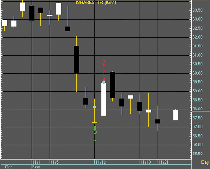 Figure 13 presents another way of looking at the same time period for IGM. An Aspen color rule is used to indicate which bars offer good entry and exit points according to the timing model.