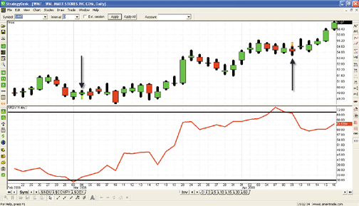 FIGURE 7: TD AMERITRADE STRATEGYDESK, ARSI. The price chart shows the 14-day ARSI indicator (red) and a backtest for ARSI crossing 30 or 70 for WMT since February 2008. In the backtest, ARSI generated a buy signal on 3/4/08 at a price of $49.87 and a sell signal on 4/9/08 at a price of $54.14. These buy and sell signals are identified with arrows on the price chart.If you have questions about this formula or functionality, please call TD Ameritrade's StrategyDesk help line at 800 228-8056, free of charge, or access the Help Center via the StrategyDesk application. StrategyDesk is a downloadable application free for all TD Ameritrade clients. Regular commission rates apply.TD Ameritrade and StrategyDesk do not endorse or recommend any particular trading strategy.