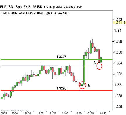 Figure 1: SPOT FX OR BINARY OPTION? On this five-minute chart of the EUR/USD, had you made the spot FX trade, you would have risked 57 pips or $570 on one standard contract. If you take the binary option trade, your risk would be about $310 on the equivalent of a standard FX contract.
