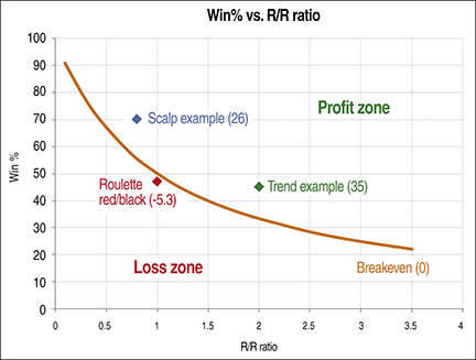 Figure 1: win% vs. r/r ratio. Here you see a comparison of the trend system (green), scalp system (blue), breakeven curve (orange), and roulette system red/black bet (red). A mathematical expectation of above 30 is generally considered to be good.