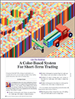 A number of readers report being unable to reproduce the results in Figure 8. As it turns out, the high percentage of profitability that was reported in the article for the color-based system was in error. This is because (as observed by Tomasz Janeczko in the July 2011 Traders’ Tips section) a one-bar delay was not applied to the trailing stop. Once the more realistic one-bar delay is applied, the profitability drops significantly.