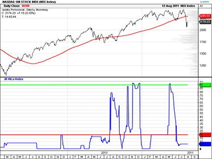 FIGURE 14: UPDATA, the JK HiLo Index. Here is an example of the JK HiLo index applied to the NASDAQ 100 Index. After the recent selloff, this indicator’s low reading would suggest the market is due to perform above average for the next equivalent period.