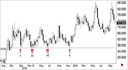 Figure 1 is a weekly coffee chart. Once the market makes a double low (points 1 and 2), we can use that as a temporary level of support. Observe how the market retraces at points 3, 4, 5, and 6 before it moves away for good. Often, the exact level (56.234) at which the dotted line is drawn is inconsequential relative to any major price points — in this case, 56.000 — when setting a stop-loss.