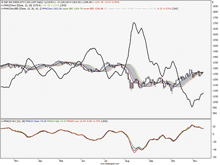 FIGURE 13: EXCEL, REVERSING MACD. Here is a sample chart of the S&P 500 with the MACD, PMACDeq, nine-period EMA of PMACDeq, and PMACDzero of the closing price.
