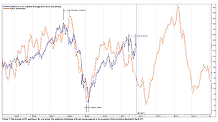 In Figure 1, you can see both the forecasted DIA weekly prices and the actual prices. The positional relationship of the curves corresponds to the maximum of the correlation function as of April 2011.