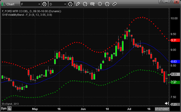 {Description: TASC, August 2013 - ""Within The Volatility band" by Sylvain Vervoort}