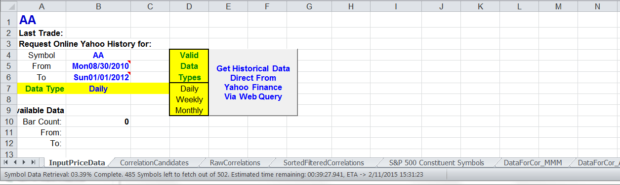 After a full S&P 500 run, the saved spreadsheet takes around 17 megabytes. To reduce this spreadsheet to a manageable download size, I have stripped out retrieved symbol data. The download should be something less than 800 kb stored on your drive.