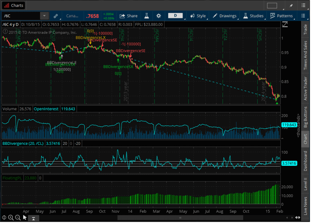 FIGURE 9: NINJATRADER. The Bollinger Band divergence is displayed above the CL and 6C, both of which display the Bollinger Bands in their respective panels. The TradingtheLoonie strategy is displayed in the 6C panel of the chart.