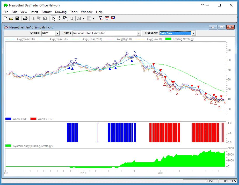 Since this system is based on bar close to generate signals, the actual trade cannot logically take place on the signal bar. So the long and short position shading used here begins and ends on the bar after an entry or exit signal.