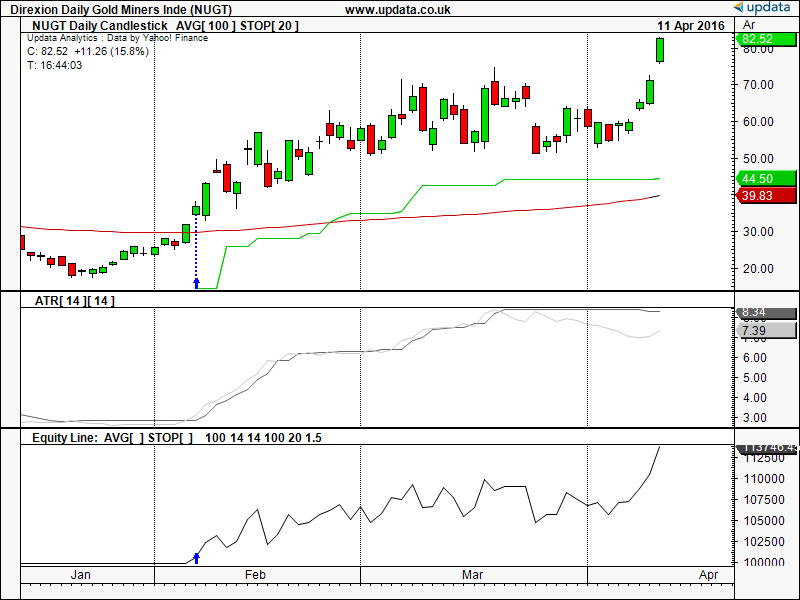 FIGURE 11: UPDATA. Here are example ATR breakout entries as applied to Direxion Gold Miner Bull (X3) ETF in daily resolution. The February 4th trade that was demonstrated in Ken Calhoun’s May 2016 S&C article is shown here with a blue arrow.