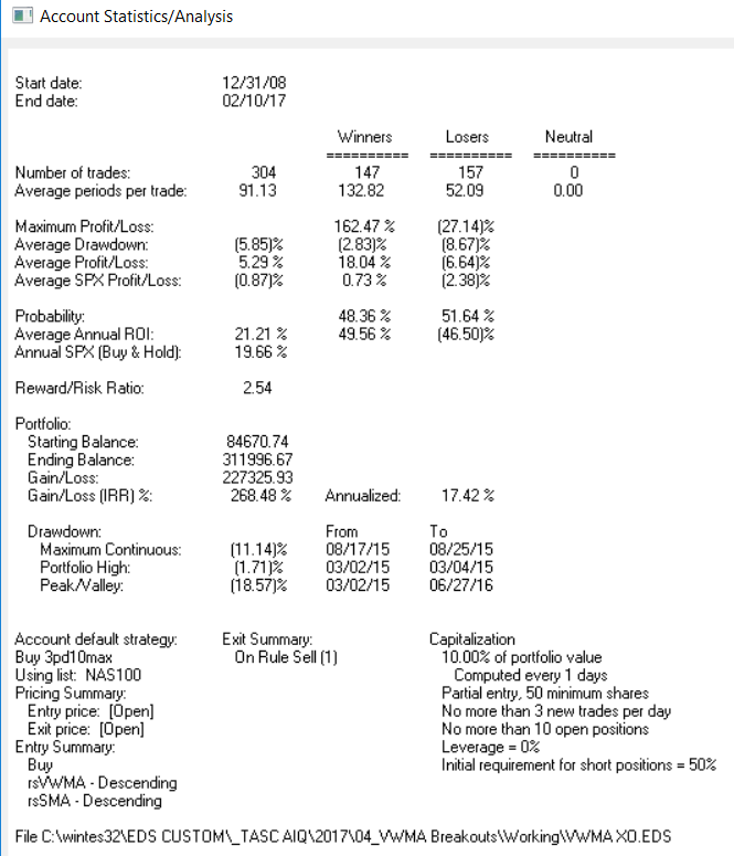 Please note that I tested the author’s system using the NASDAQ 100 list of stocks on daily bars rather than intraday bars from 12/31/2008 thru 2/10/2017. Figure 7 shows the resulting equity curve trading the author’s system with the cross-down exit. Figure 8 shows the ASA report for this test. The annualized return showed about a 17% return with a maximum drawdown of 19%.