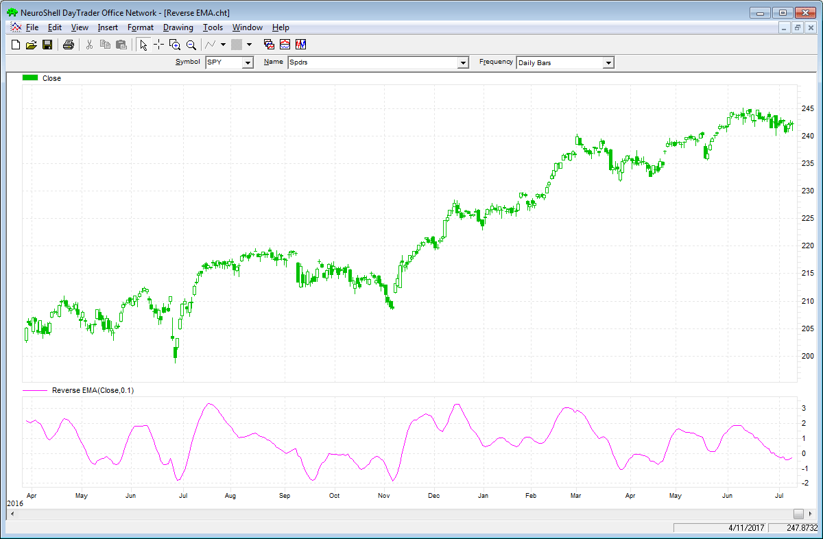 FIGURE 10: NINJATRADER. Here is an example of the reverse EMA indicator on a daily SPY chart between June 2016 and July 2017 as displayed in Figure 1 of John Ehlers’ article in this issue, “The Reverse EMA Indicator.”