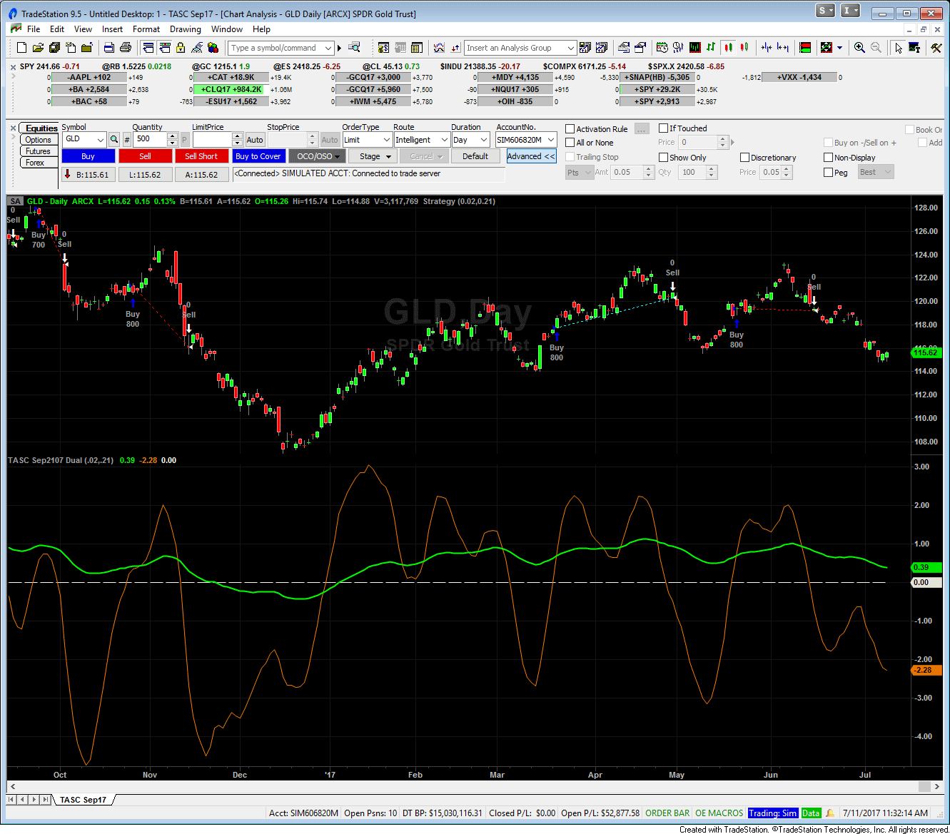 FIGURE 1: TRADESTATION. This shows a TradeStation daily chart of GLD with the reverse EMA strategy and indicator applied.