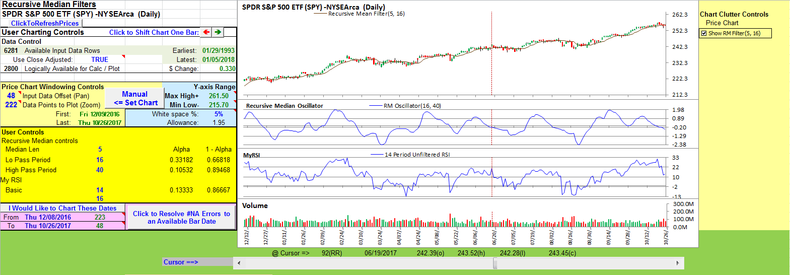 FIGURE 12: EXCEL. This sample chart shows the recursive median filter plotted on price. The subcharts are plots of the recursive median oscillator and an unfiltered RSI.