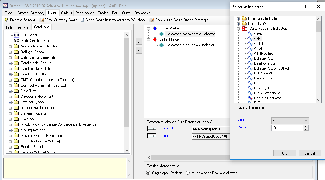 Here, we are providing the TradeStation EasyLanguage code for an indicator and strategy based on the author’s work. We have also included the code for an AMA function so you can easily include the AMA in your own EasyLanguage code.