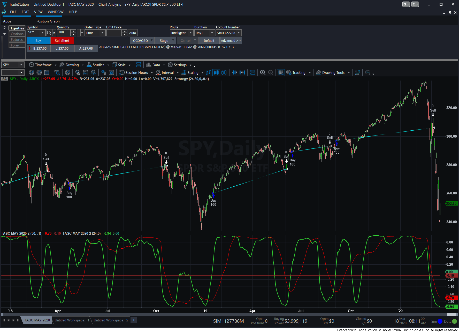 FIGURE 1: TRADESTATION. The correlation trend indicator and strategy are applied to a daily chart of the SPDR S&P 500 ETF.