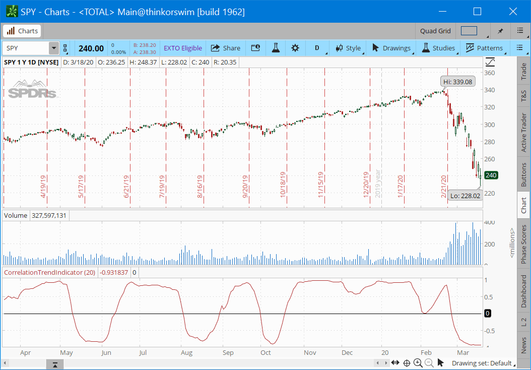 As I write this, the anticipation of COVID-19 has begun to disrupt local and global economies and markets. Figures 11 and 12 use the correlation indicator to examine a couple of popular symbols under the influence of COVID-19.