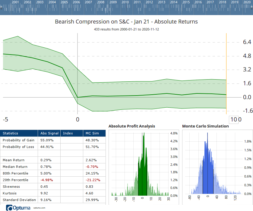 FIGURE 9: OPTUMA. This chart displays sample test results for the bearish compression pattern with a trend filter.